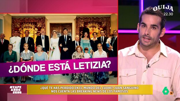 El periodista Juan Sanguino visita Zapeando para comentar las noticias más destacadas de las revistas del corazón. En 'Hola' se hacen eco de la boda de Victoria López-Quesada y Enrique Moreno de la Cova. Ella es la ahijada del rey Felipe VI y, además, fue protagonista involuntaria de la boda de los reyes debido a que Froilán decidió darle una patada en plena ceremonia.