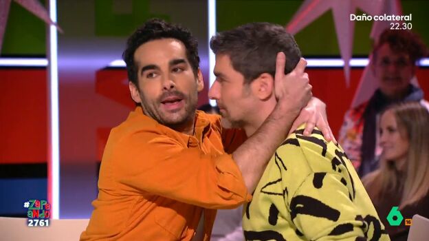 El cómico no lo duda un segundo y se presta a la simulación. "Qué lanzado", le dice Juan a Nacho. El periodista, imitando a Casas, cuenta que el actor agarra con ambas manos por la nuca a la cantante. La cara que pone Nacho en el 'teatrillo' provoca las risas de Juan. "Pareces un pájaro", le dice Dani Mateo.