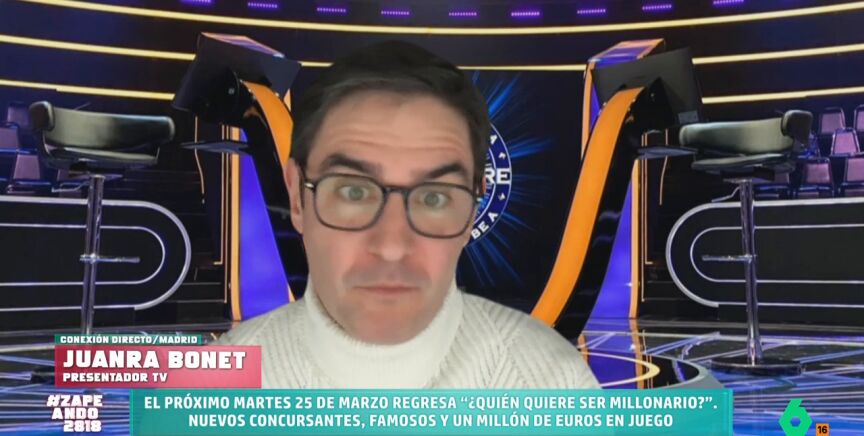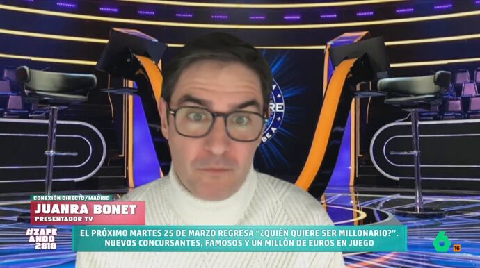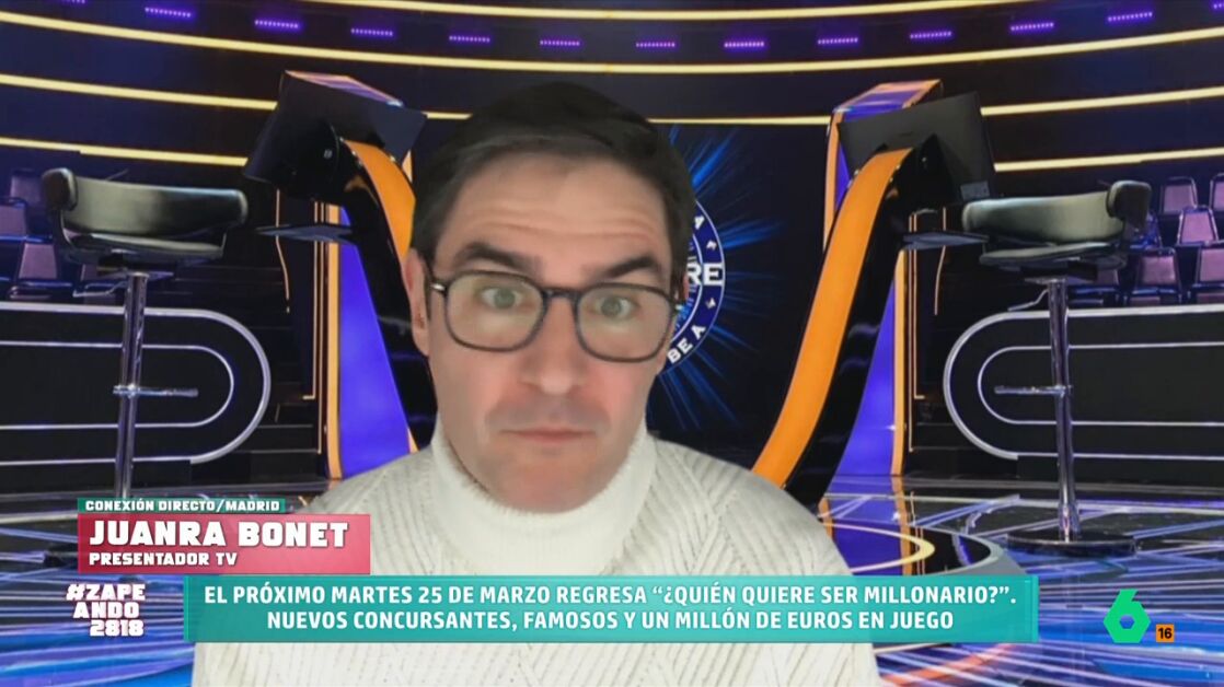 Zapeando conecta con Juanra Bonet para adelantar las claves de la nueva temporada de '¿Quién quiere ser millonario?' que regresa a laSexta el próximo martes 25 de marzo. "Es un lugar seguro, toda la familia se puede sentar a ver cosas nuevas en un formato que es siempre el mismo, y eso es mágico", afirma el presentador.