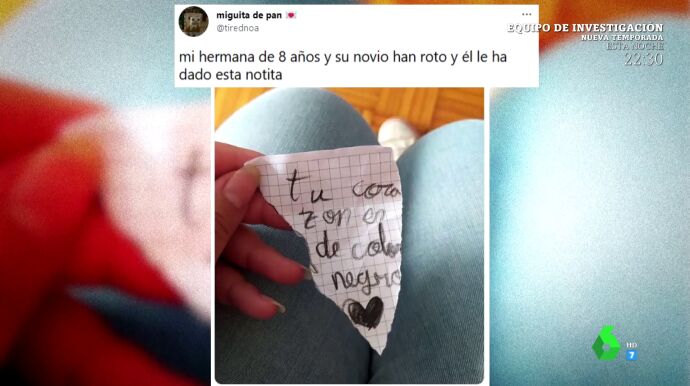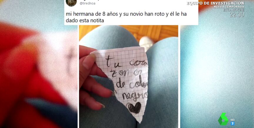 Y es que una tuitera ha compartido la nota que ha recibido su hermana, una niña de ocho años, de su expareja tras romper con él. "Tu corazón es de color negro", expone el pequeño en un cacho de papel de cuadros. Puedes conocer la historia al completo en el vídeo principal de esta noticia.