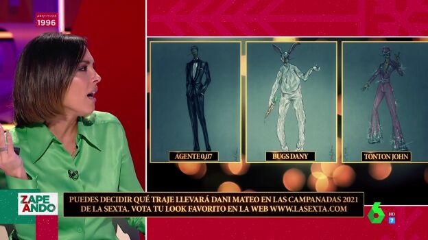 Cristina Pedroche ya sabe qué se va a poner en las Campanadas 2021, pero Dani Mateo todavía no. Y es que al presentador de Zapeando le "pilla de nuevas" presentar las Campanadas y, como se le da mal tomar decisiones, ha tenido una idea: que sean los espectadores del programa el que elijan su look. Por eso, Lorena Castell le ayuda a presentar los tres posibles looks.