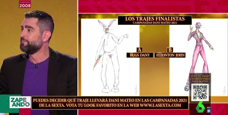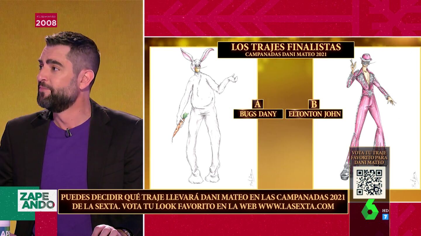 "Yo quiero estar guapo", afirma Dani Mateo de su look de las Campanadas. El presentador afirma que le gustaría ir de ElTonton John. ¿El motivo? "Me hace más ilusión porque Pepa, la persona que lo está haciendo lleva poniendo piedrecitas hasta las 3 de la mañana varias semanas", explica Dani Mateo, que confiesa que se ha probado los dos: "Creo que me va a tocar lucir escotazo, tengo dudas de dejarme mechón salvaje o quitarme los tres pelos, o igual me los tiño de rosa".