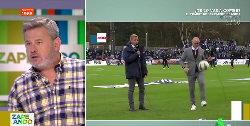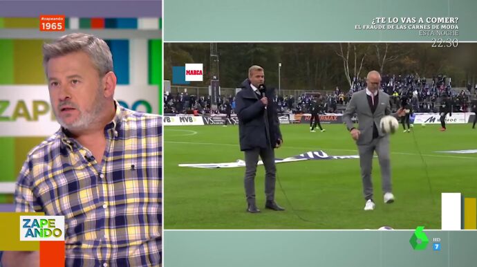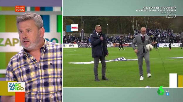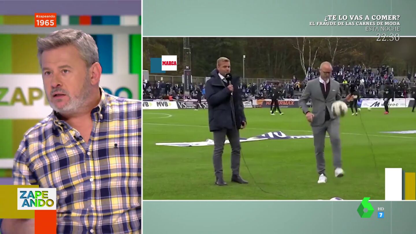 "A ver si vemos algún día haciendo algo asó a Juanma Castaño, aunque lo dudo ahí lanzo el reto", afirma Miki Nadal al ver este vídeo en el que dos comentaristas deportivos dan toques al balón en directo.