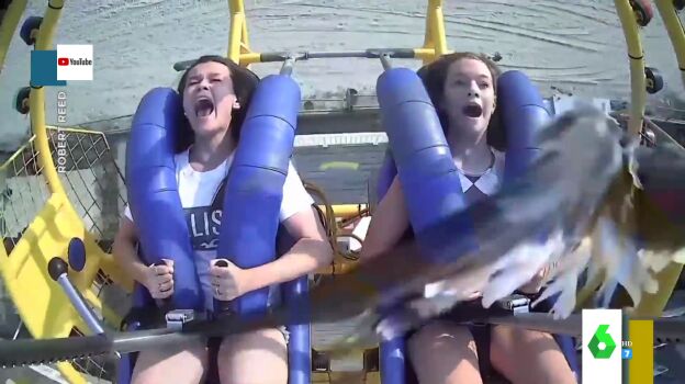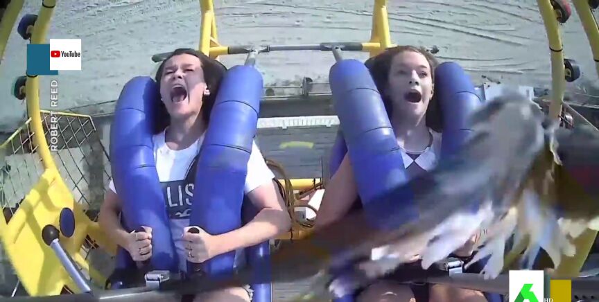 Las cámaras de la atracción de un parque grabaron el momento en el que una paloma impacta en la cara de una de las usuarias.
