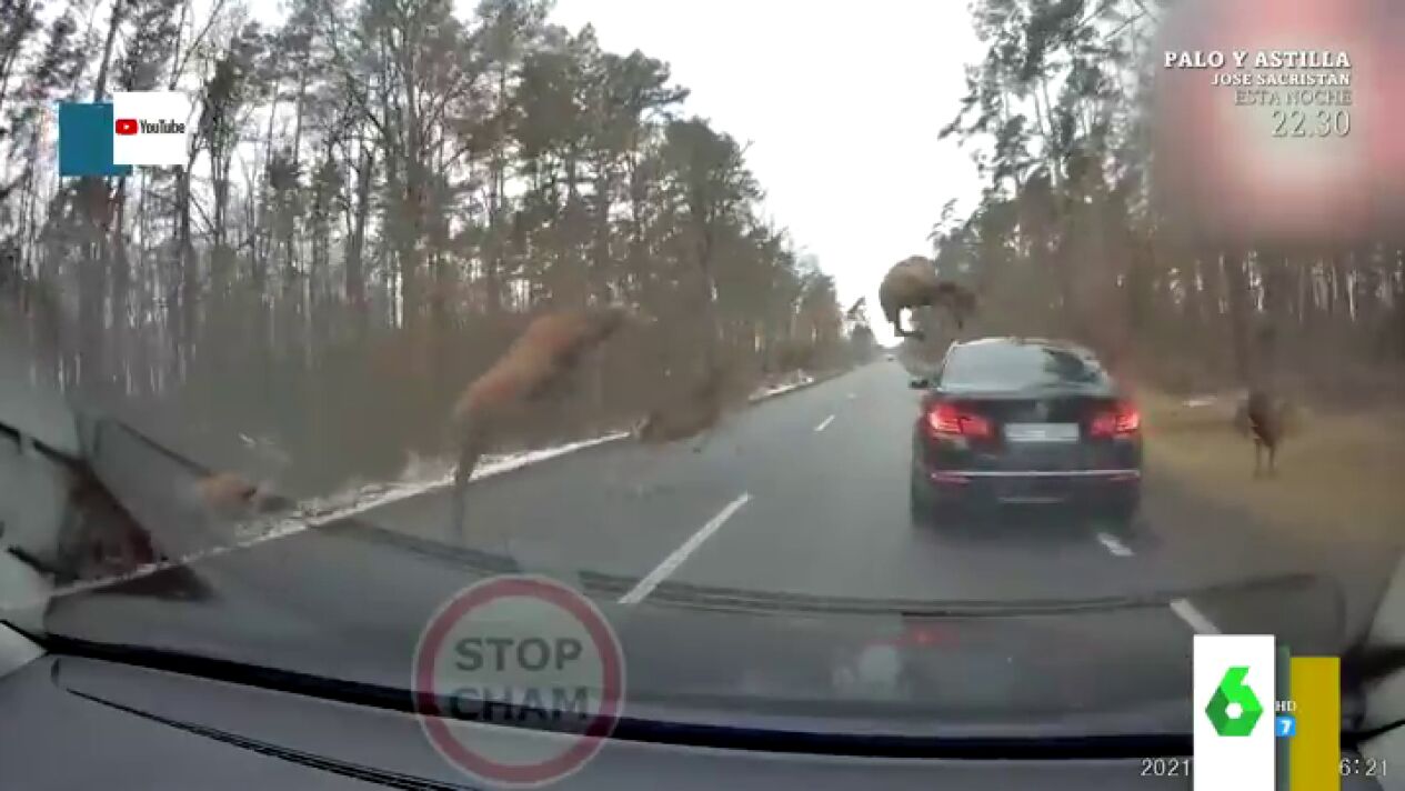 En las impactantes imágenes se puede ver cómo los animales cruzan la carretera y, aunque la mayoría consiguen zafar los vehículos, uno de ellos acaba chocando contra el maletero, sin resultar herido.
