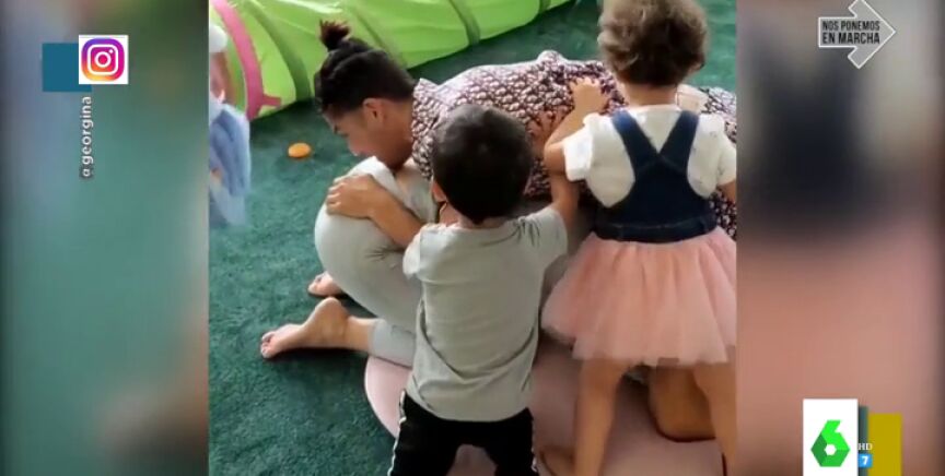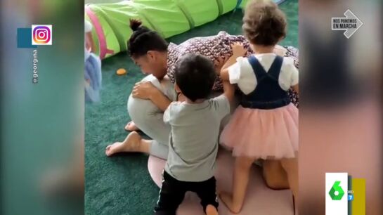 En el vídeo se puede ver cómo, de broma, Cristiano se pone encima de Georgina mientras esta pide "ayuda a sus hijos", quienes rápidamente acuden al rescate de su madre empujando al deportista.