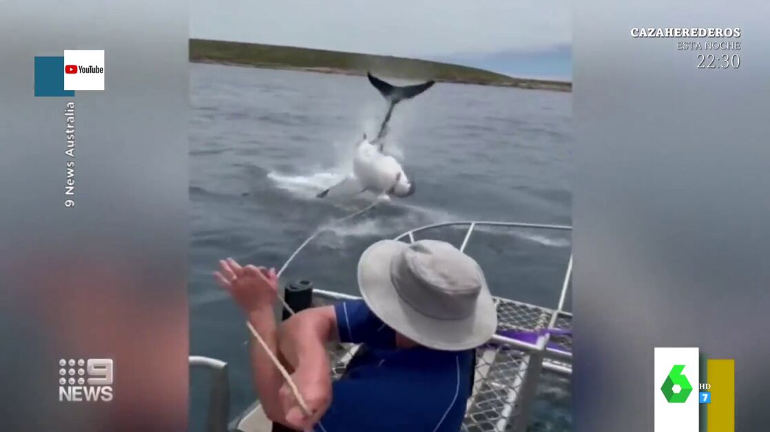 Lorena Castell enseña el vídeo del tremendo salto que realiza un tiburón blanco en Australia, justo delante de un barco con un grupo de turistas.