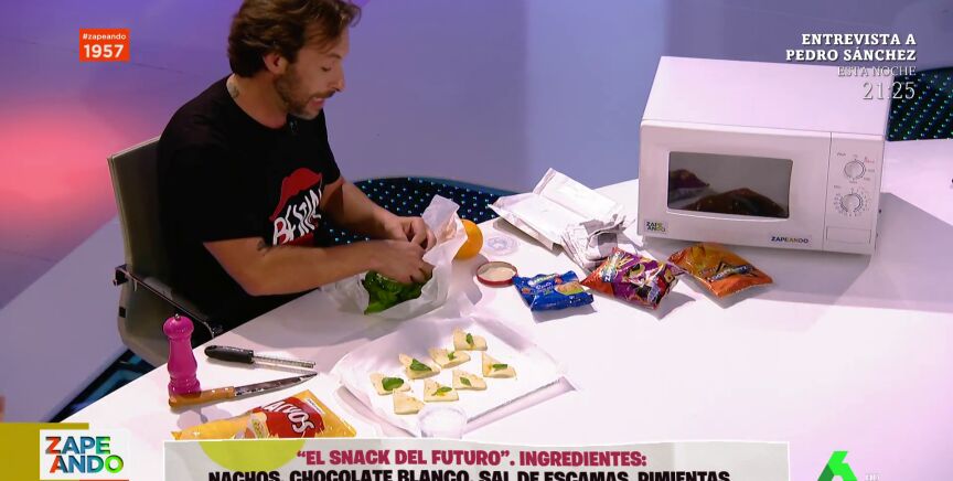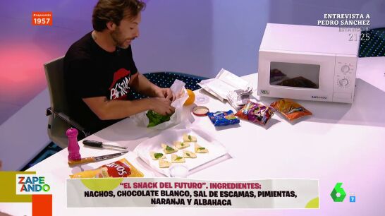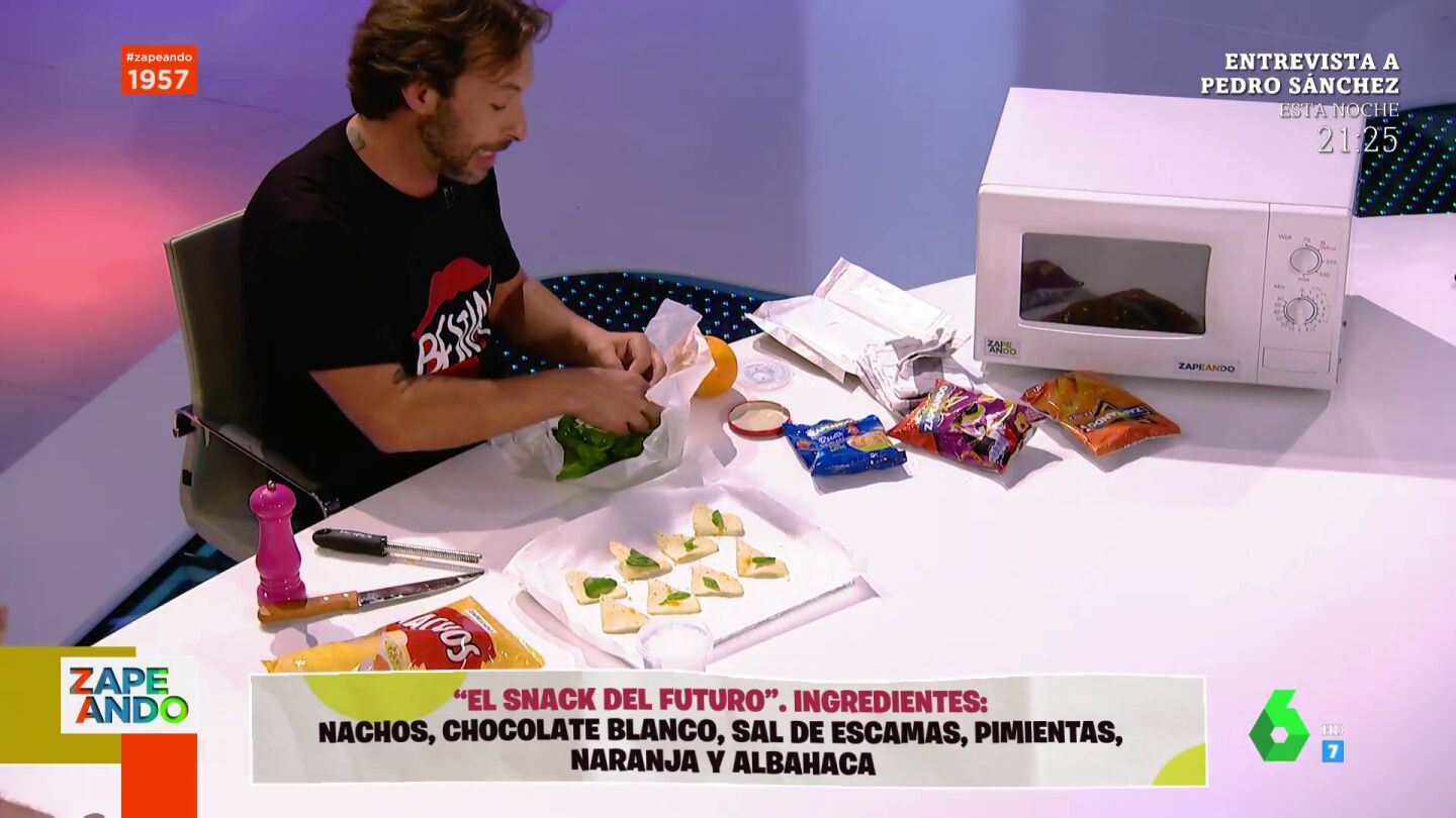 Esta vez, el chef crea en el plató "el snack del futuro": nachos, chocolate blanco, sal y naranja. "Esta mezcla es dios", afirma Pablo Albuerne ante la sorpresa de los zapeadores, que no confían en que esa mezcla sepa bien. Puedes ver sus reacciones al comer esas mezcla en el vídeo principal de esta noticia.