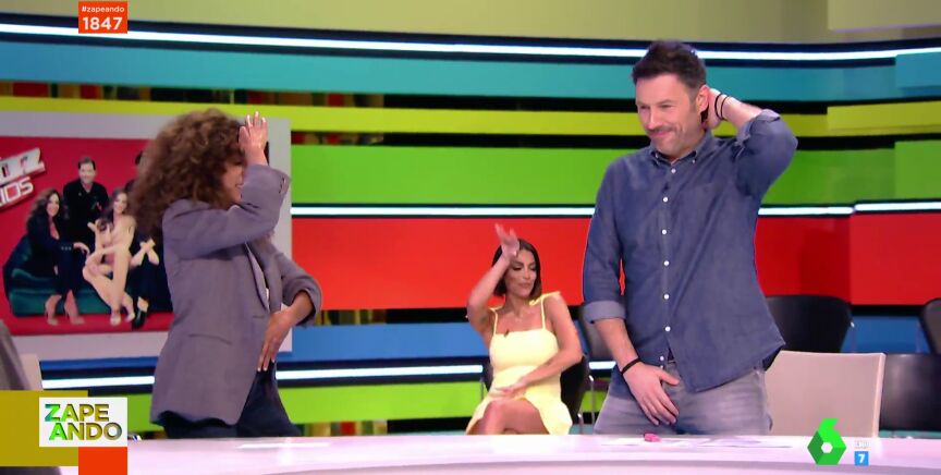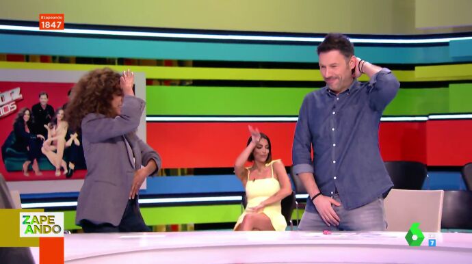 "Me he quedado con las ganas de ver a Iñaki hacer lo de las piernas", destaca Dani Mateo, que pide a Urrutia que imite el mítico movimiento de Rosario Flores en su primer día como zapeador. "¿En mi primer día tengo que hacer esto?", pregunta Urrutia, que sorprende a todos con un movimiento un cuanto extraño.