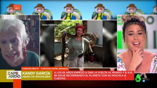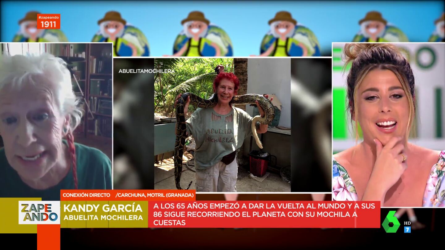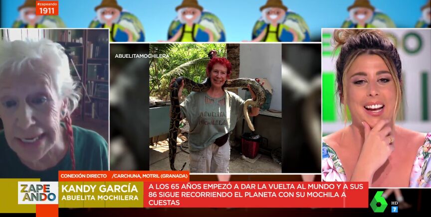 Dani Mateo entrevista en el plató de Zapeando a través de una videollamada a Kandy, más conocida como 'la abuelita mochilera', quien después de dar la vuelta al mundo y visitar más 70 países, sigue en plena forma y las mismas ganas que el primer día.