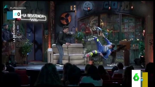 La caída de Broncano en La Resistencia tras intentar hacer saltar el airbag del mono de Joan Mir: "¡Qué hostia me he dado!"