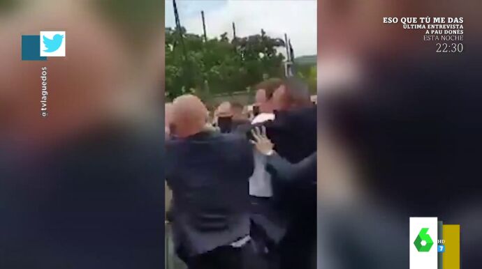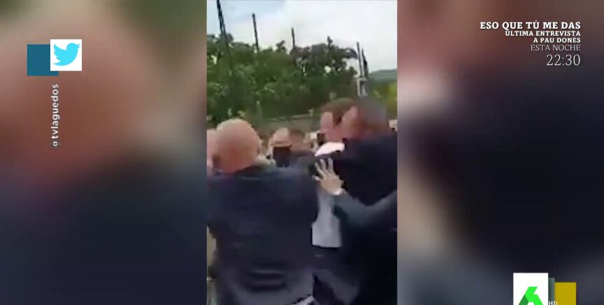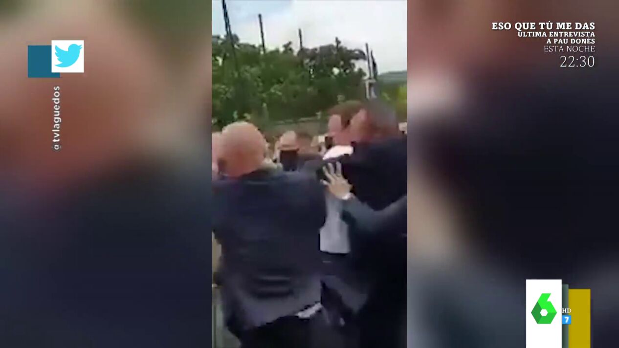 "A mí me gustaría pedir el VAR porque creo que no toca cara", afirma Cristina Pedroche, pero el resto de los zapeadores destaca que sí le da. Es más, Quique Peinado señala que "Macron carga brazo": "Macron, si le dejan ahí se lía, porque según le pegan carga brazo como diciendo 'te reviento', y se lo llevan de ahí". Puedes ver en el vídeo de arriba el impactante momento.