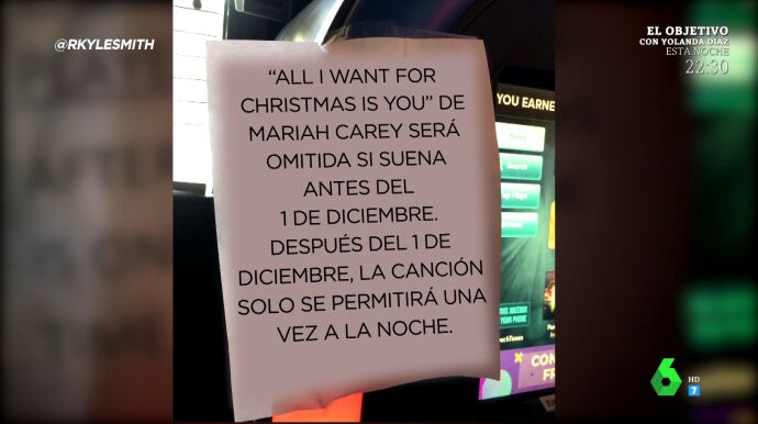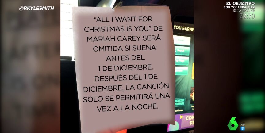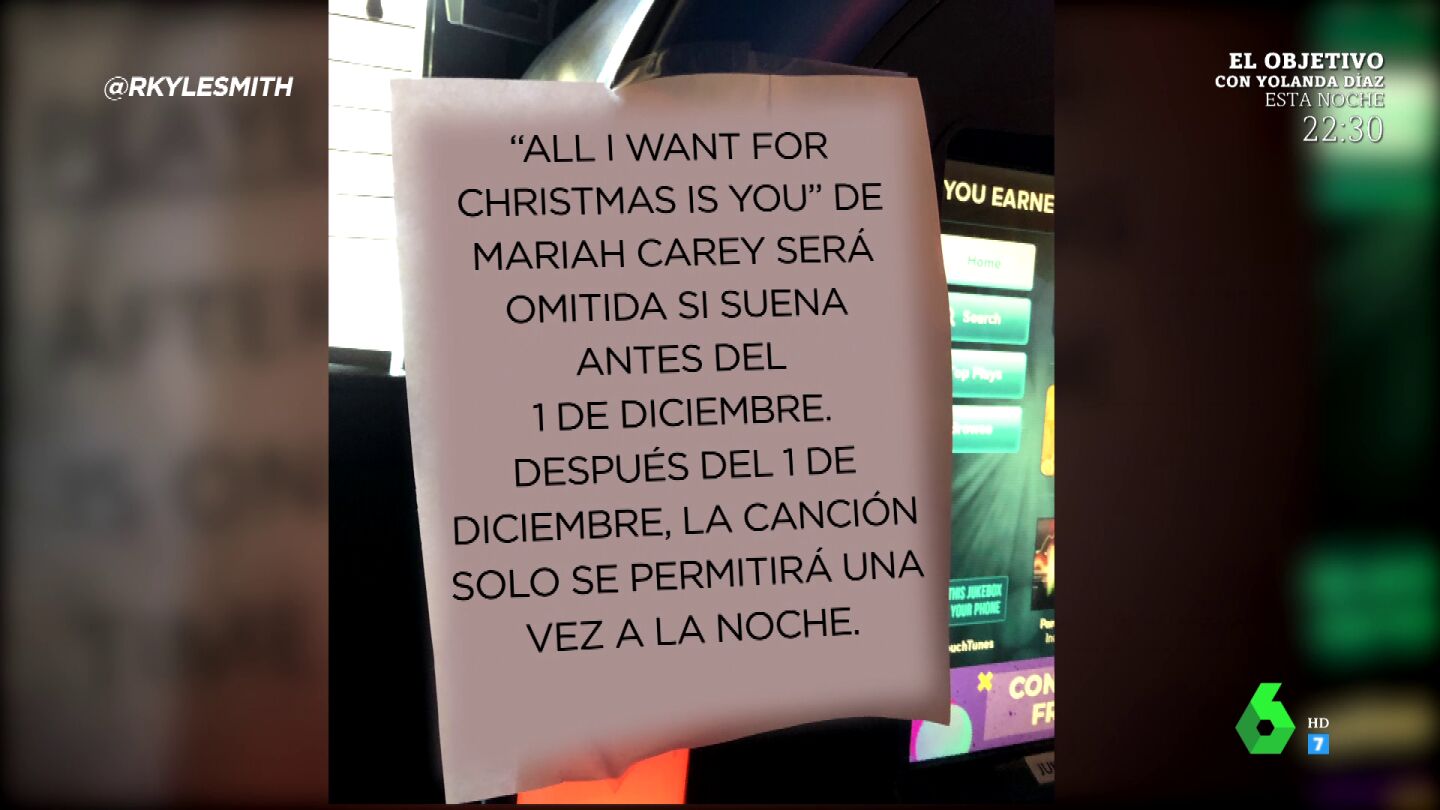 Por otro lado, los zapeadores comentan el caso de un bar de Dallas, que ha colgado un cartel junto a la gramola a modo de aviso. "'All I Want For Christmas Is You', de Mariah Carey, será omitida si suena antes del 1 de diciembre. Después del 1 de diciembre, la canción solo se permitirá una vez a la noche", indica dicho cartel. Dani Mateo dice además estar de acuerdo con el dueño, porque el tema, "más de una vez carga".