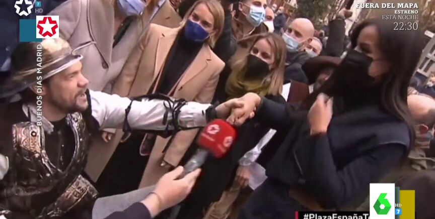 En la inauguración había dos hombres disfrazados de los personajes de Cervantes y Masegosa no se pudo resistir a incluirlos en su reportaje. Primero, hablando con un perro, después conquistando a las 'Dulcineas' que se encontraban por el camino hasta que, finalmente, encontró a su 'Dulcinea' de verdad. Y no, no es el alcalde de Madrid aunque también se encontraba en el lugar sino la vicealcaldesa, Begoña Villacís. Puedes ver el surrealista momento en el vídeo de arriba, en el que incluso, Iñaki López y Cristina Pardo afirman estar alucinados tras verlo.