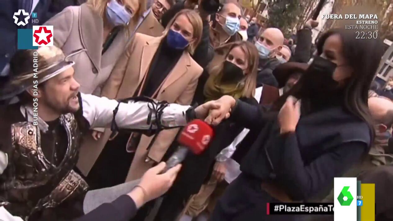 El momentazo en el que el Don Quijote de Plaza España 'pasa' de Almeida para conquistar a Villacís: "¡Dulcinea!"
