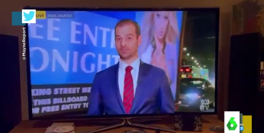 El periodista realizaba una conexión en directo cuando un camión que anunciaba la entrada gratuita a un local de striptease se paró justo detrás de él, llenando toda la pantalla.