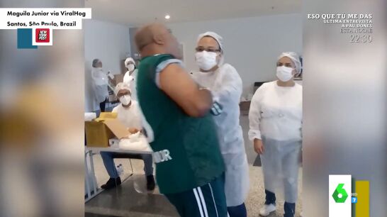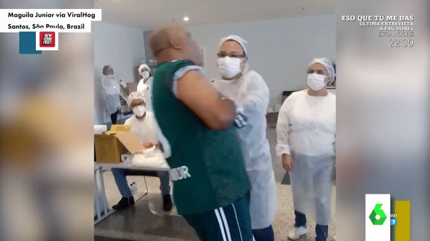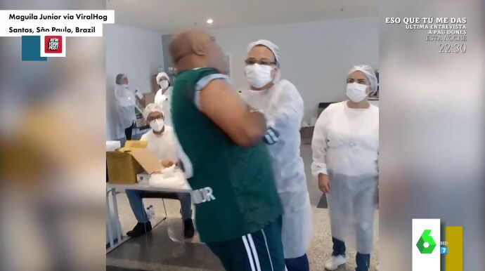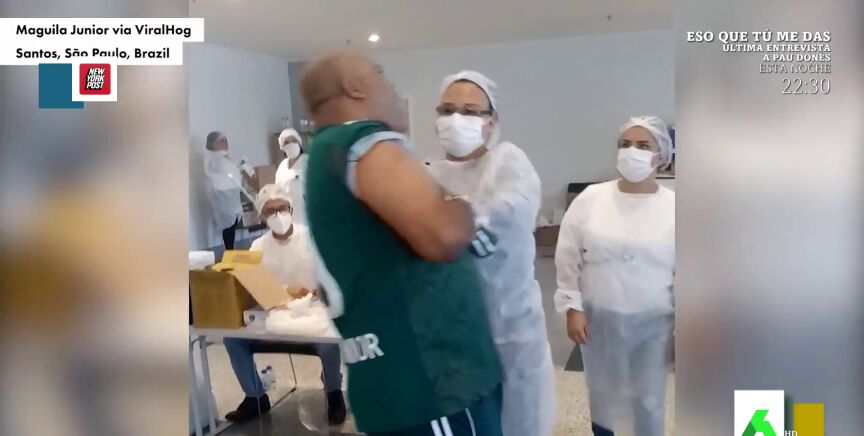 No nos cansamos de ver a gente pasándolo mal al vacunarse. Esta vez ha sido en Brasil. Cristina Pedroche muestra en este vídeo de Zapeando la inesperada caída de un hombre como un "armario de dos puertas" al caer "como un saco de patatas" cuando la enfermera le pincha. "¿Seguro que la enfermera no es Lorena disfrazada para hacerle un tatuaje?", bromea Dani Mateo.