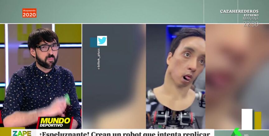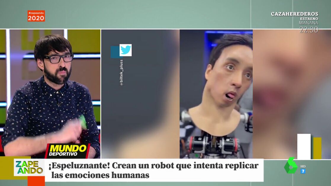 Quique Peinado muestra en Zapeando un robot muy particular: se trata de una cabeza robótica que trata de emular las emociones humanas... aunque, a juicio del zapeador, se queda un poco por el camino. "Este pobre autómata no lo está pasando bien", sostiene Peinado, para quien los gestos del androide son los de "Roncero cuando pierde el Madrid".