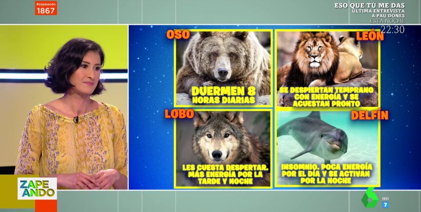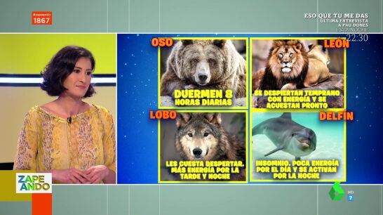 Vanessa Guerra explica en Zapeando los diferentes cronotipos del sueño que existen y cómo estos se asocian a diferentes animales: en este vídeo puedes descubrir si eres oso, lobo, león o delfín.