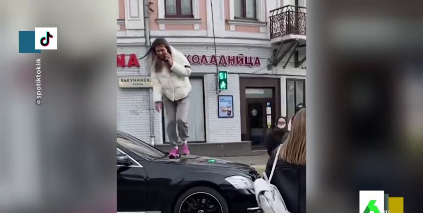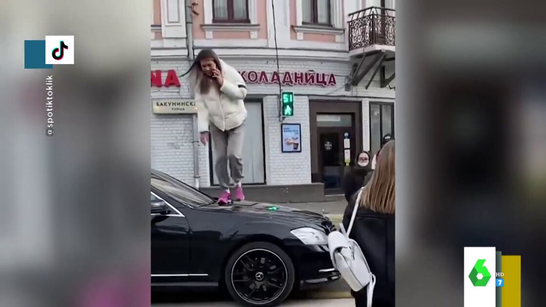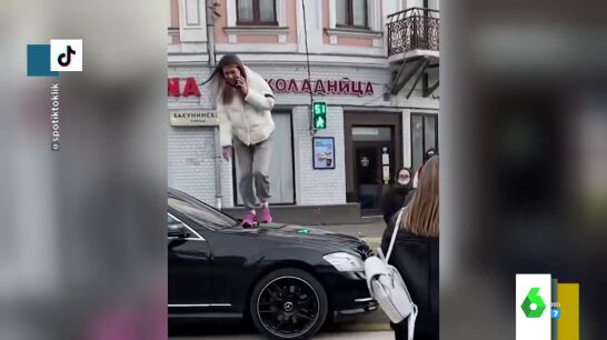 "Allí no se nadan con tonterías, si te pones en medio, los peatones se suben y te pisan el coche para pasar por el mismo sitios", destaca Valeria Ros, que resalta cómo el resto de peatones no pueden evitar reírse e, incluso, celebrar la reacción de la chica como venganza porque el coche no le deje pasar y le obligue, en principio, a rodearlo. "Solo un ruso cruza por encima del capó de un coche negro en Rusia", bromea Dani Mateo sobre este viral que puedes ver en el vídeo principal de esta noticia.