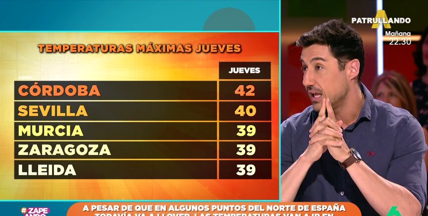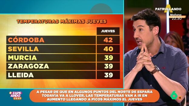 Según el colaborador de Zapeando, las ciudades que se encuentran el alerta son las siguientes: Córdoba con 42 grados, Sevilla con 40 grados, y Murcia, Zaragoza y Lleida con 39 grados. Ante este repunte de las temperaturas, Dani Mateo se interesa en saber cómo pueden afectarle a él que vive en la sierra. Por desgracia, Cacho le ha asegurado que ya no va a poder tranquilo.