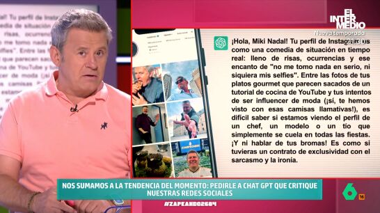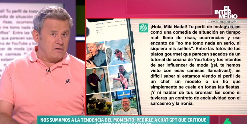El análisis de Miki Nadal fue aún peor, pues la IA criticó sus dotes culinarias. "Las fotos de tus platos gourmet parecen sacadas de un tutorial de cocina de YouTube". Unas palabras que no han gustado nada al humorista. "El día que ChatGPT tenga piernas, va a haber mucha cola para partírselas", 'amenazó' Nadal.