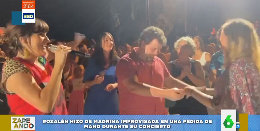 Durante su concierto en la localidad granadina de Salobreña, Rozalén se bajó del escenario para ser la testigo y madrina en la petición de mano. Como buena madrina, la artista le hizo a la pareja su primer regalo: cantarles uno de sus temas. Puedes ver el momentazo en el vídeo principal de esta noticia.