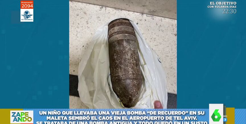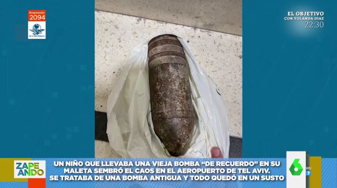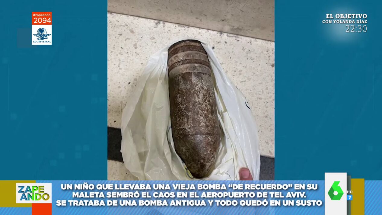 Un niño ha desatado el pánico en el aeropuerto de Tel Aviv (Israel), tal y como se puede apreciar en este vídeo que muestra Quique Peinado a sus compañeros de Zapeando. Al parecer, el peque se llevaba de recuerdo del país una vieja bomba que había encontrado durante su viaje, generando, así, un tremendo caos cuando descubrieron el 'suvenir' que llevaba en su maleta en uno de los controles. "Decidieron llevárselo de recuerdo a casa, en avión", explica el de Vallecas, "es que la gente es muy lista".