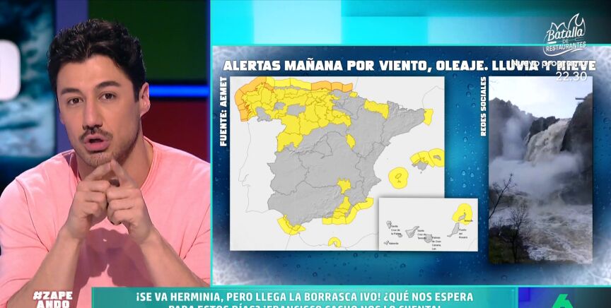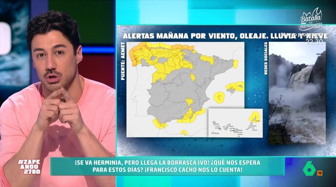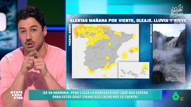 Francisco Cacho visita el plató de Zapeando para dar a conocer la previsión del tiempo para lo que queda de semana. El meteorólogo apunta que mañana miércoles "llega la borrasca Ivo", siendo esta "la cuarta de gran impacto" en apenas diez días.