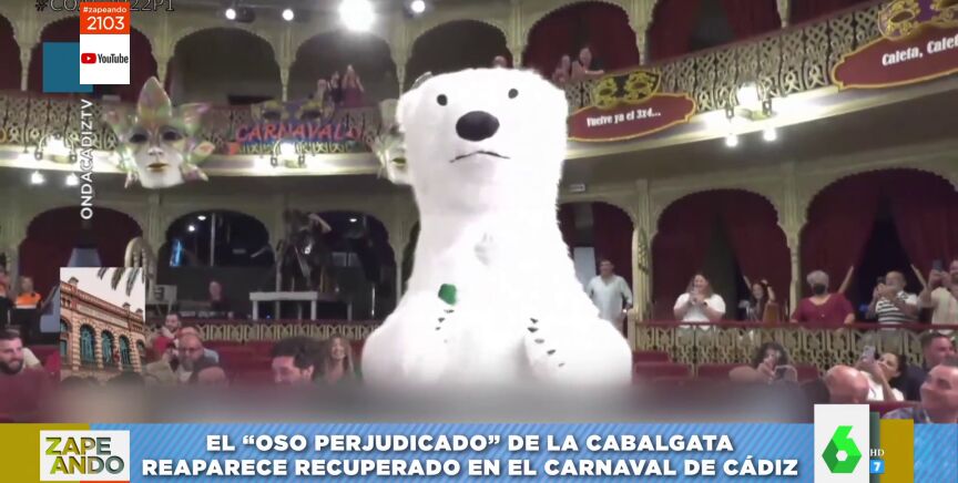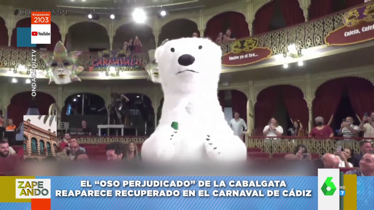 En este vídeo, Dani Mateo muestra las imágenes del oso con un aspecto totalmente renovado durante el "concurso de agrupaciones" que se celebró este pasado lunes en el teatro Falla de Cádiz y que supone el "pistoletazo de salida del Carnaval 2022", después de que este se aplazara de febrero a la primera semana de junio.