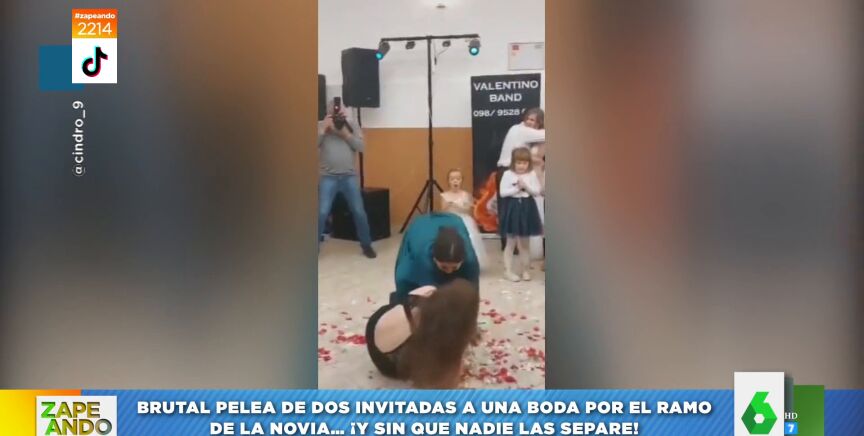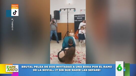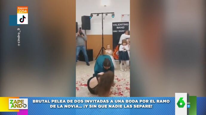 Dani Mateo muestra a sus compis de Zapeando "la brutal pelea de dos invitadas de una boda para hacerse por lo civil o por lo criminal por el ramo de novia", comenta el presentador, que da paso a este viral que está arrasando en redes.