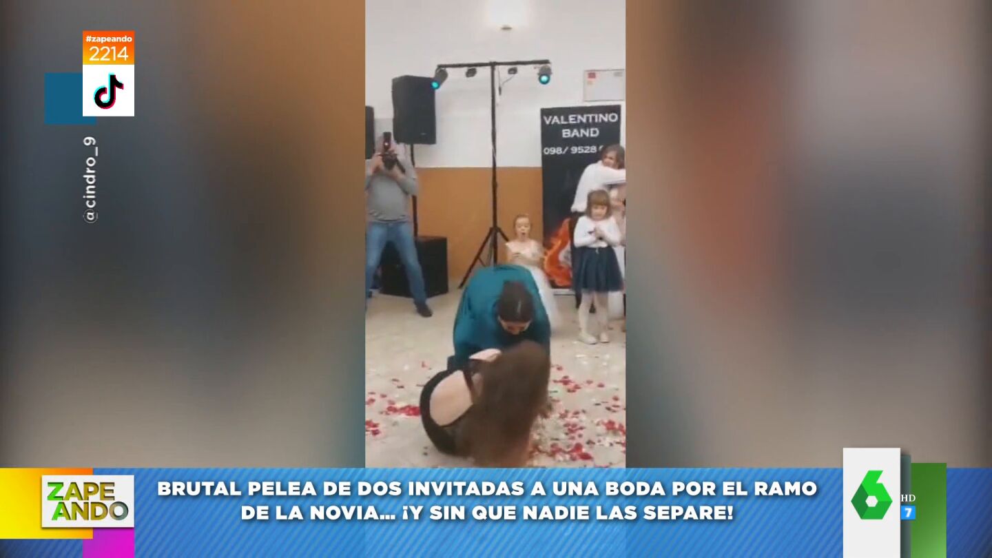 Las jóvenes, que se han vuelto virales después de que otro de los invitados compartiera el momentazo en sus redes sociales, acaban tiradas por el suelo intentándose arrebatar el ramo. ¿Quién ganará? Puedes ver la pelea entre las dos chicas en el vídeo principal de la noticia.