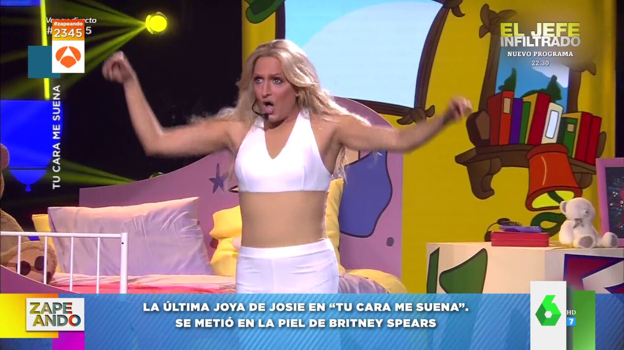 Josie se mete en la piel de Britney Spears, en "su versión veinteañera", apunta Isabel Forner, en 'Tu cara me suena'. El experto en moda interpreta el tema 'Lucky', con el que termina en séptima posición en la última gala "y eso que clavó la coreografía", apunta Isabel Forner.