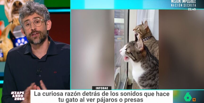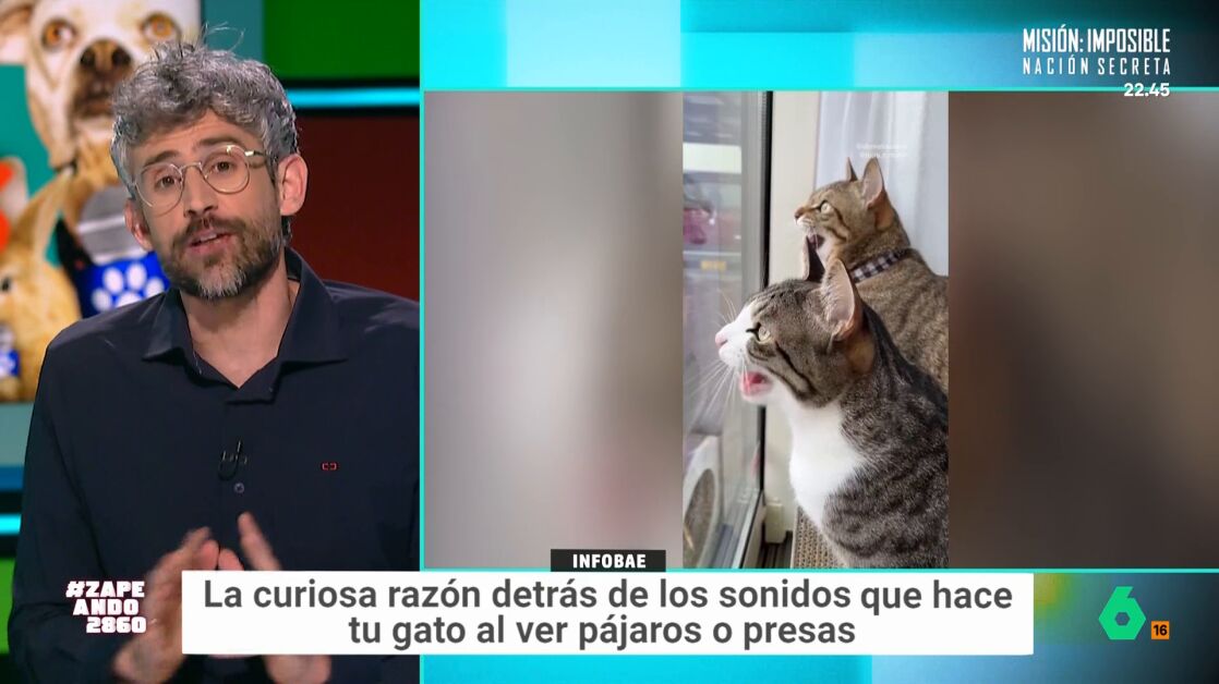 Los gatos, a veces, hacen un llamativo sonido cuando miran por la ventana. "Es tan gracioso como inquietante", afirma Nacho García. Este sonido se denomina 'chirping' felino y el veterinario Víctor Algra visita Zapeando para hablar sobre ello.
