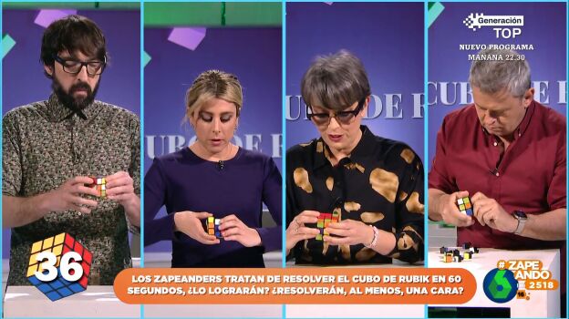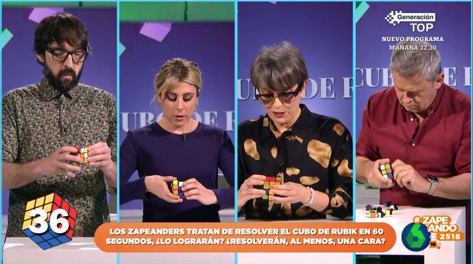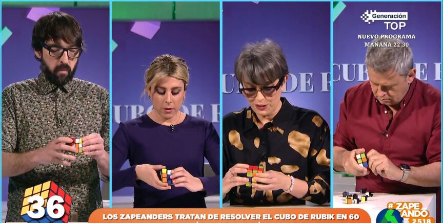 El famoso cubo de Rubik cumple 50 años desde que fuera diseñado por el arquitecto húngaro Erno Rubik y para celebrarlo, en Zapeando, retan a los zapeadores a resolver uno en un minuto. Dani Mateo señala que el vencedor será aquel que complete todas las caras o, al menos, una de ellas.