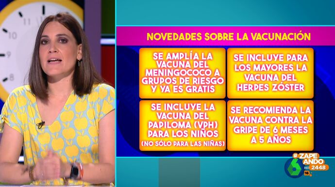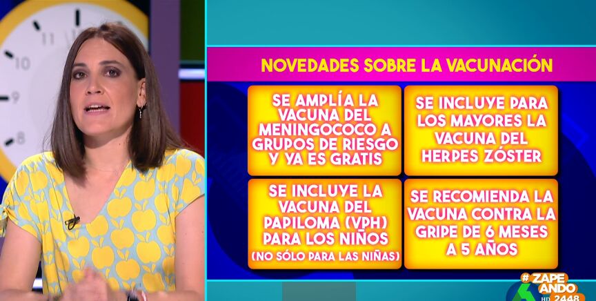 Boticaria García cuenta en Zapeando que existe un nuevo calendario de vacunación común para niños y adultos y señala que incorpora cuatro novedades muy importantes. Entre ellas, destaca la ampliación de la vacuna del meningococo B a los grupos de riesgo, que antes solo se administraba a los bebés y había que pagarla, mientras que ahora será gratuita para todos.