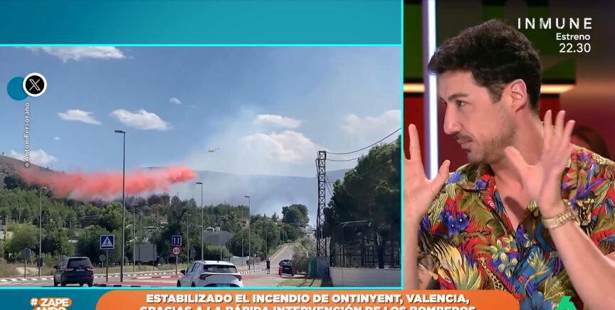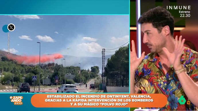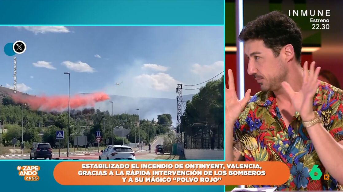 Iñaki Urrutia le ha preguntado a Francisco Cacho qué es ese "polvo rojo" que se ve en el video del incendio en Ontinyent, Valencia. Según, ha explicado el meteorólogo, el polvo rojo es un retardante de fuego que hace que los materiales tarden más en quemarse, facilitando así la extinción del incendio.