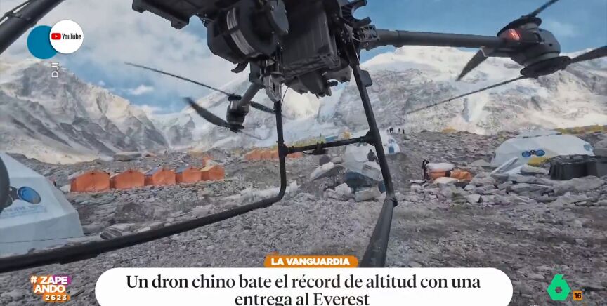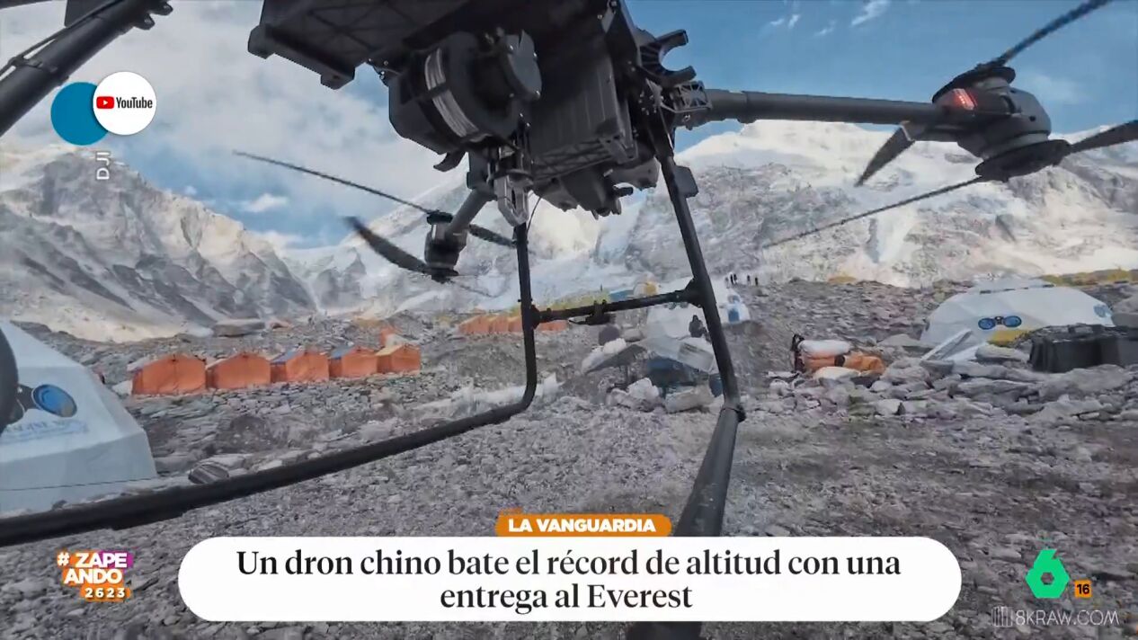Dani Mateo presenta un vídeo que, según él, "es un ejemplo de como el turismo evoluciona y como está cada vez más masificado". Como se puede ver en las imágenes, el presentador de Zapeando se refiere al hito que ha protagonizado un dron: ha logrado llegar hasta el campo 1 del Everest, a más de 6000 metros de altitud, para hacer una entrega.