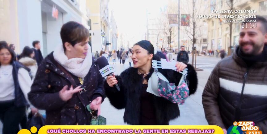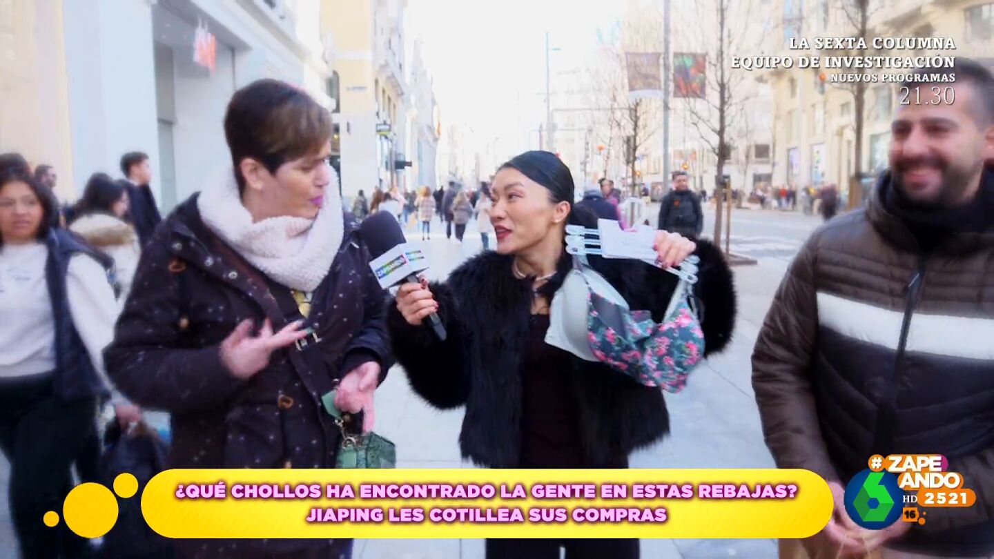 Jiaping ha salido de rebajas por la Gran Vía de Madrid para analizar qué prendas adquiere la gente. En su trayecto se ha topado con una pareja de Barcelona que ha ido a la capital exclusivamente a encontrar gangas. La reportera decide sacar una a una las prendas. "Son todo sujetadores", se sorprende. "Este es más sexy, para noches de ocasión", le cuenta ella.