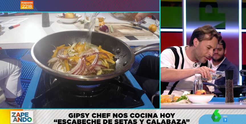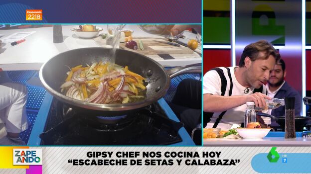 Gipsy Chef cocina en Zapeando un escabeche con setas y calabaza, que tiene una preparación "muy básica y resultona". Según explica, "la gracia del escabeche es balancear ese ácido con un poco de dulce para que sea impecable y en este caso la calabaza le va a venir increíble".
