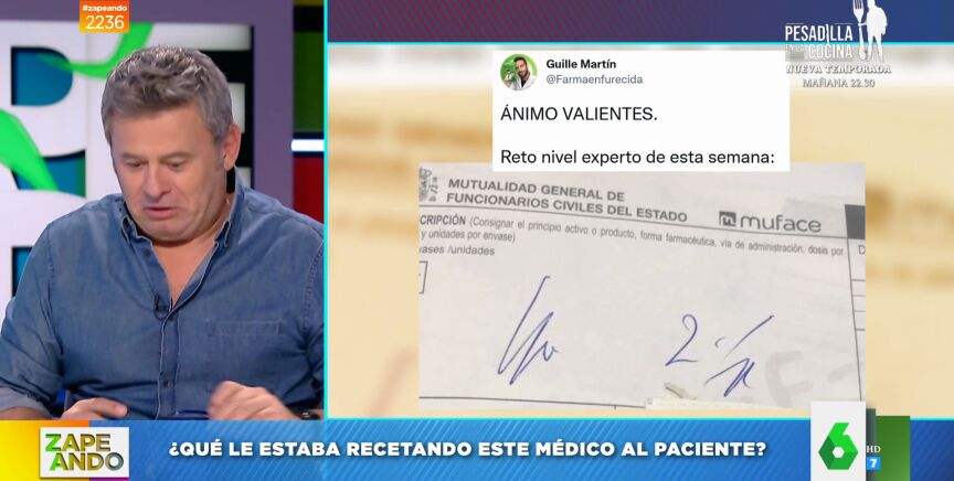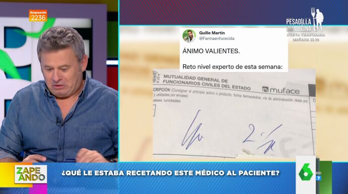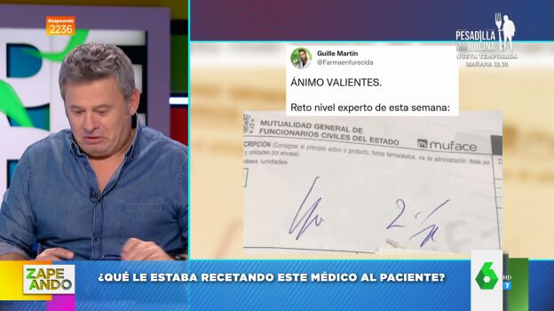 "Comenzamos con un reto", anuncia Dani Mateo nada más comenzar Zapeando. Se trata de la "prueba de comprensión lectora" a la que el farmacéutico Guille Martín ha sometido a sus seguidores de Twitter con los que ha compartido esta receta médica que se ha vuelto viral. "Quiere que averigüemos qué estaba recetando el médico", comenta el presentador con sus compañeros".