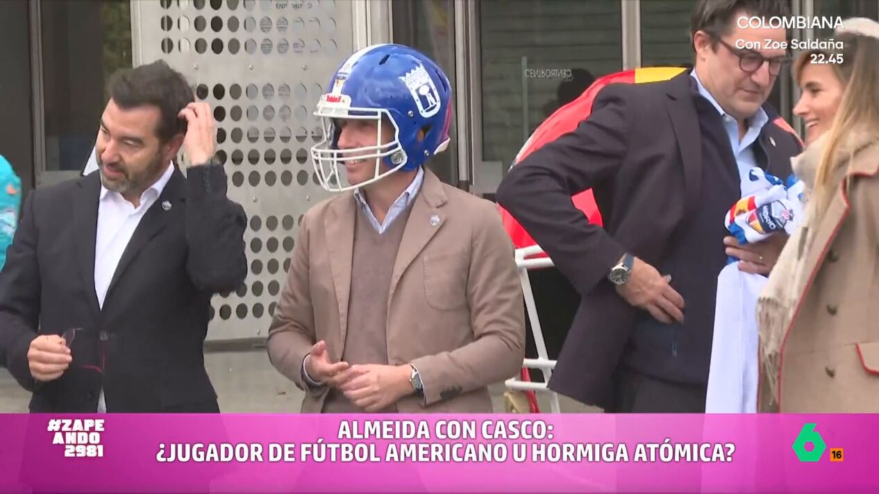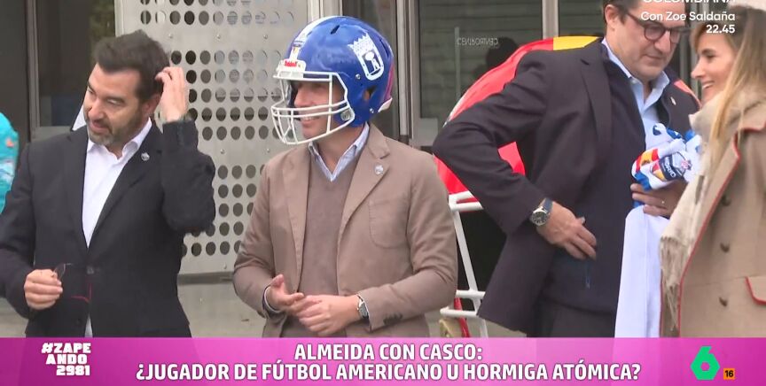 "Aprovechando el partido mucha gente se ha subido a la locura por el fútbol americano", comenta Maya Pixelskaya, "entre ellos el alcalde de la ciudad, José Luis Martínez Almeida". El regidor madrileño se puso, incluso, un casco para sumarse al espíritu deportivo americano. "Parece un primo de la Hormiga Atómica", afirma la zapeadora. "Como jugador, no sé, pero como mascota de algún equipo lo veo", afirma Quique.