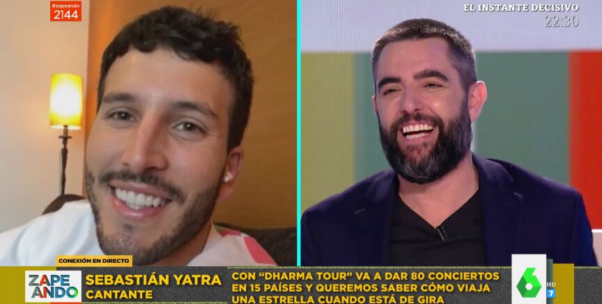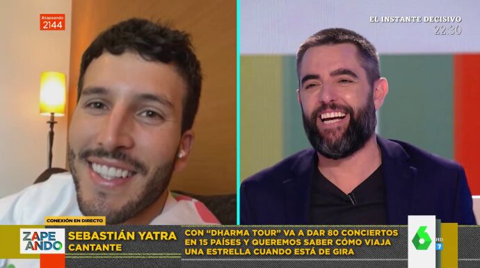 Dani Mateo conecta en directo con Sebastián Yatra, quien nada más aparecer en pantalla demuestra que se sabe el nombre de todos los zapeadores presentes. El coach de La Voz Kids se encuentra de gira con 'Dharma Tour' con el que dará 80 conciertos en 15 países.