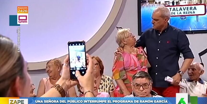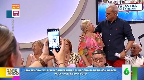"Oye, Ramón, ¿me puedo hacer una foto contigo?", le espeta una señora del público a Ramón García durante la emisión en directo del programa. El presentador, sorprendido, se acerca a ella y accede a su petición.