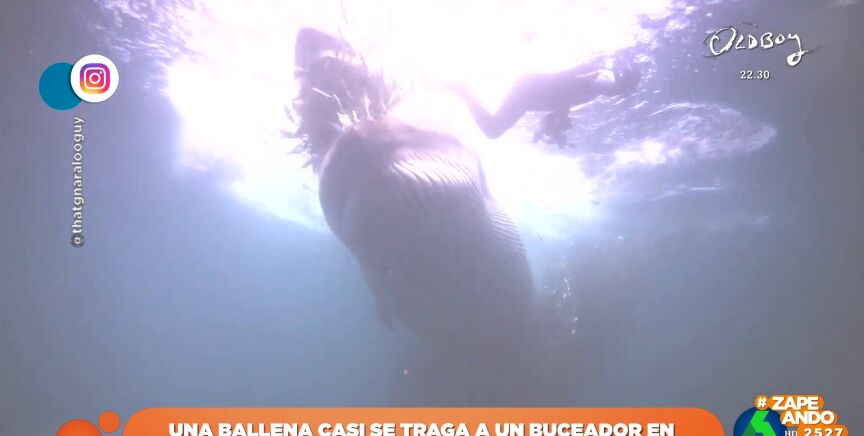 El animal pasa por su lado mientras abre la boca para comerse algunos de esos peces y el zapeador apunta que "estuvo a punto de ser él el segundo plato" tras ver la corta distancia a la que esta se queda del buceador.