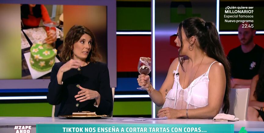 En redes sociales se ha vuelto tendencia cortar las tartas con una copa de vino y comer el dulce directamente con una cuchara desde la misma copa. Una práctica que muchos consideran original y práctica, pero que ha generado polémica. En Zapeando, la experta en protocolo María José Gómez Verdú no ha dudado en opinar sobre esta curiosa moda.