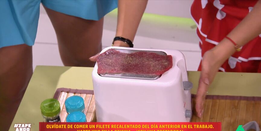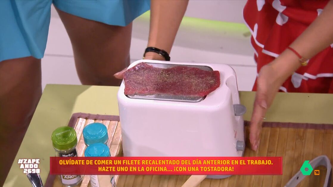 Jiaping nos enseña hoy en Zapeando un curioso menú para enterrar el táper y comer recién hecho en la oficina, incluso si se trata de un filete. Para ello, solo necesitamos el típico tostador que tenemos en nuestro lugar de trabajo, sobre el que pondremos el filete con sal y especias.