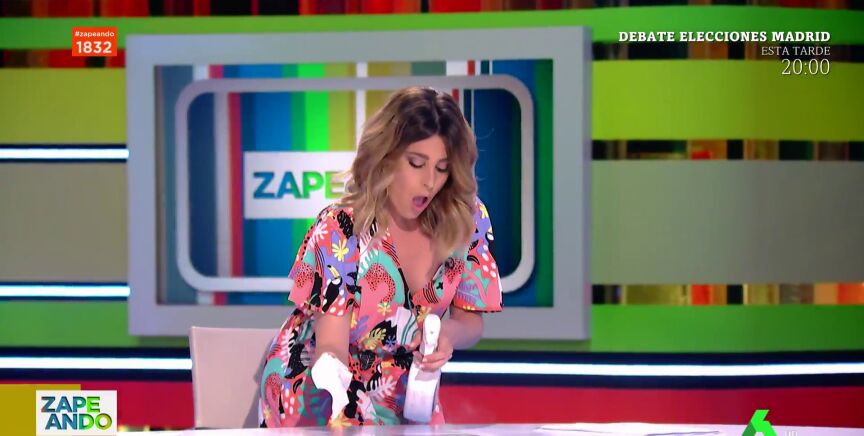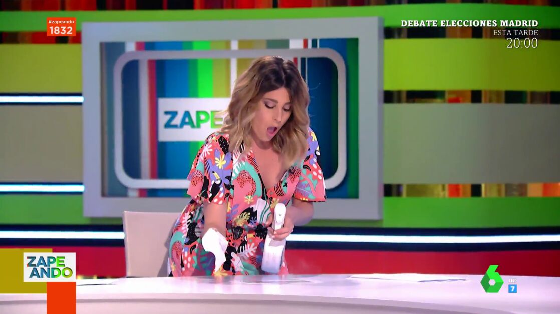 Valeria Ros debe desinfectar su lado de la mesa para dar paso en plató a Renata Zanchi, que visita el programa con su ya tradicional sección sobre música. Mientras la zapeadora termina, Miki Nadal recuerda que es el cumpleaños de Quique Peinado: "¡Ha cumplido 46 años!".