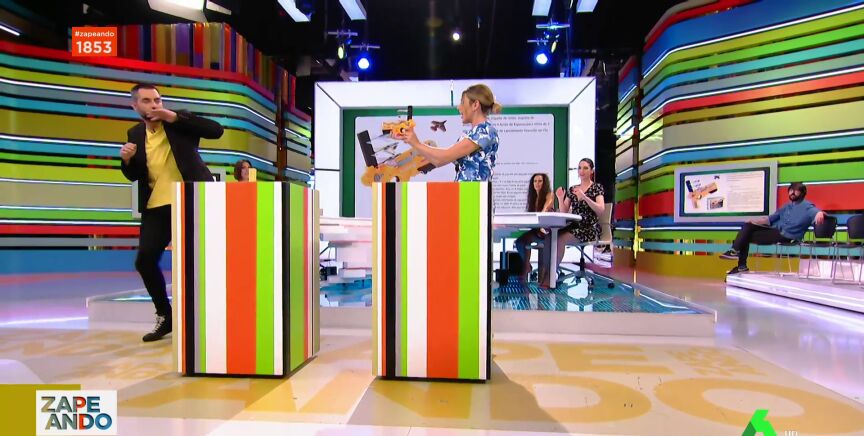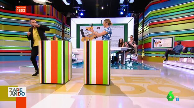Valeria muestra en pleno plató junto a Dani Mateo cómo funciona. Eso sí, la zapeadora asusta al resto de sus compañeros al apuntarles. "No apuntes para aquí", destaca Cristina Pedroche mientras que Dani Mateo le repite, mientras se tapa, que no apunte con una pistola cargada. Además, la pistola no termina de funcionar, protagonizando un surrealista momento en el que los zapeadores no pueden evitar reírse mientras Valeria Ros afirma que "menos mal" que no tiene pinganillo para escuchar las críticas del director porque se vendría abajo. Puedes ver el cómico momento completo en el vídeo principal de esta noticia.