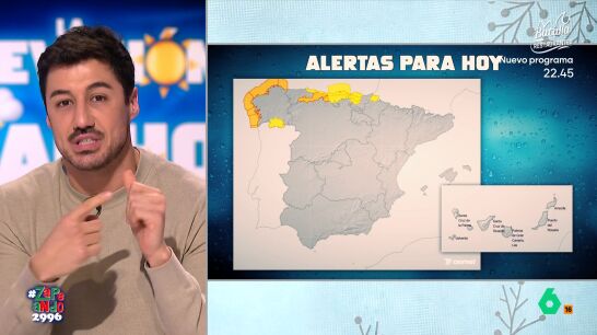 "Siguen activaos en Galicia, Asturias, Cantabria, Euskadi y Navarra por viento y oleaje", comenta Cacho, y añade que algunos de estos avisos son de nivel naranja. "Por favor, no hay que acercarse a las costas", pide el colaborador.